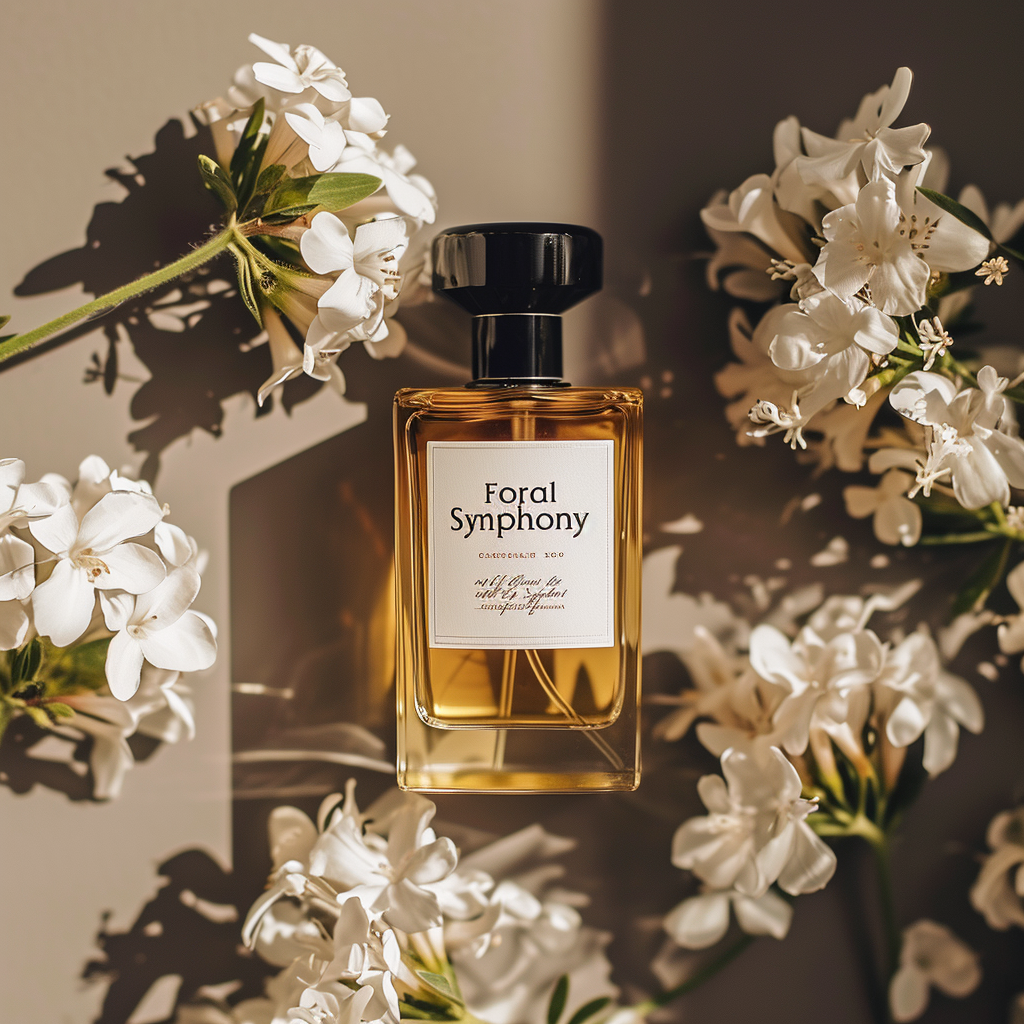 Prompt: “A minimalistic product shot of a bottle of perfume on a clean backdrop with the words “Floral Symphony”, surrounded by fragrant white flowers”