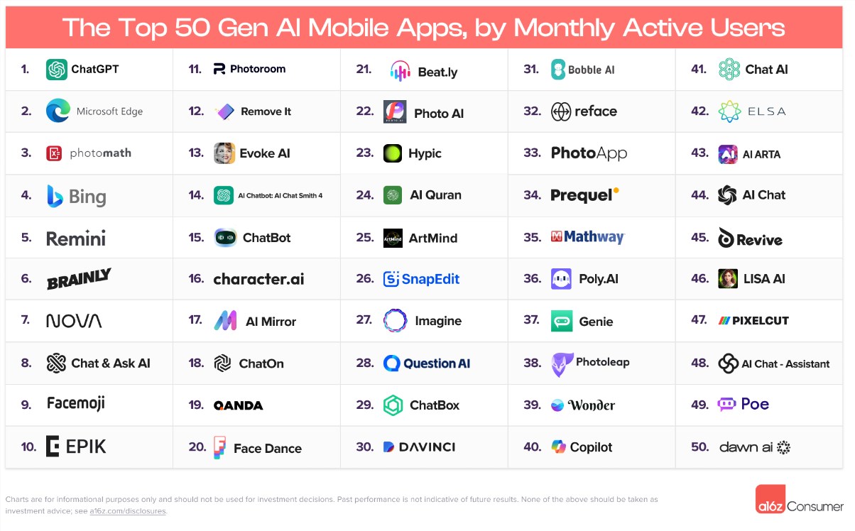 新的公司也在排行榜上崭露头角,其中包括Liner、Anthropic和三款AI伴侣应用程序。AI伴侣应用程序作为一种主要用例,正变得越来越普遍,不仅限于男朋友和女朋友的模式,还包括友谊、导师、娱乐甚至医疗等功能。
