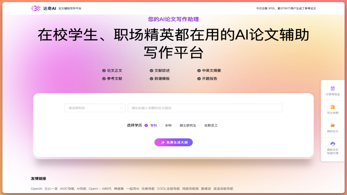 Darch AI dissertation assistance writing platform is an AI platform integrated with advanced artificial intelligence technology, which is tailor-made for school students and workplace elites. The platform provides users with efficient and intelligent dissertation writing support through deep learning and natural language processing technologies. The core advantage of Dage AI dissertation assistance writing platform is its powerful intelligent writing function and rich academic resources. The platform is able to automatically generate a free dissertation outline based on the topic selection direction and research direction entered by the user. At the same time, the platform provides an intuitive and easy-to-use editing interface, in which users can edit and modify the outline content of the paper, in which users clearly...- 1.6k