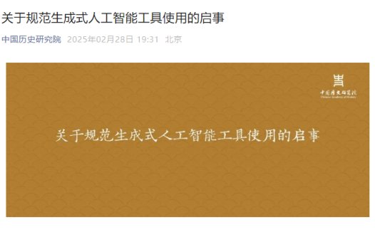 3 月 3 日消息,中国历史研究院 2 月 28 日发布《关于规范生成式人工智能工具使用的启事》(下称《启事》)。 《启事》提到,为更好利用生成式人工智能促进史学研究,丰富历史研究的技艺与方法,推动实现人工智能与历史学的融合发展,积极应对生成式人工智能给史学研究可能带来的社会风险和科技伦理挑战,构建人机协同时代的科研新秩序,该社特启事如下: 1.本社期刊不接受生成式人工智能工具参与投稿署名。 2.…- 1.8k