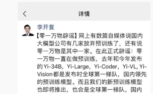 李开复:零一万物没有放弃预训练模型,新模型也即将推出